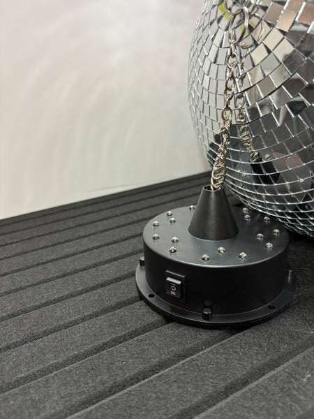 DISCO1-30: Facettenkugel mit 30 cm Durchmesser, 18 LEDs und einer 20 cm langen Kette an der Basis.