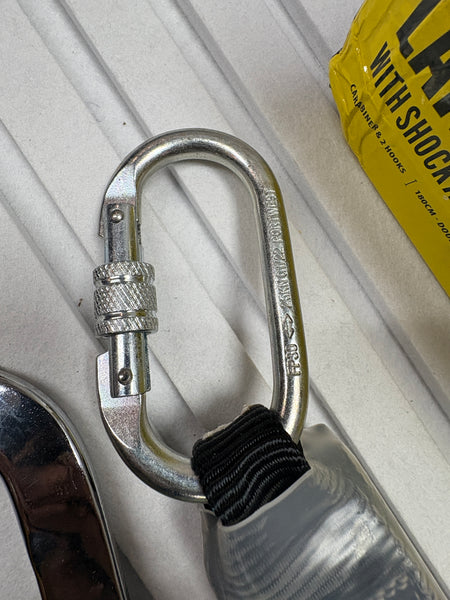 ✅GESTALTUNG UND FUNKTIONALITÄT: Ein 2-strängiges elastisches Halteband mit Bandfalldämpfer sowie Automatikkarabiner und zwei Gerüsthaken. Gedehnte Länge inklusive Karabiner 180cm.